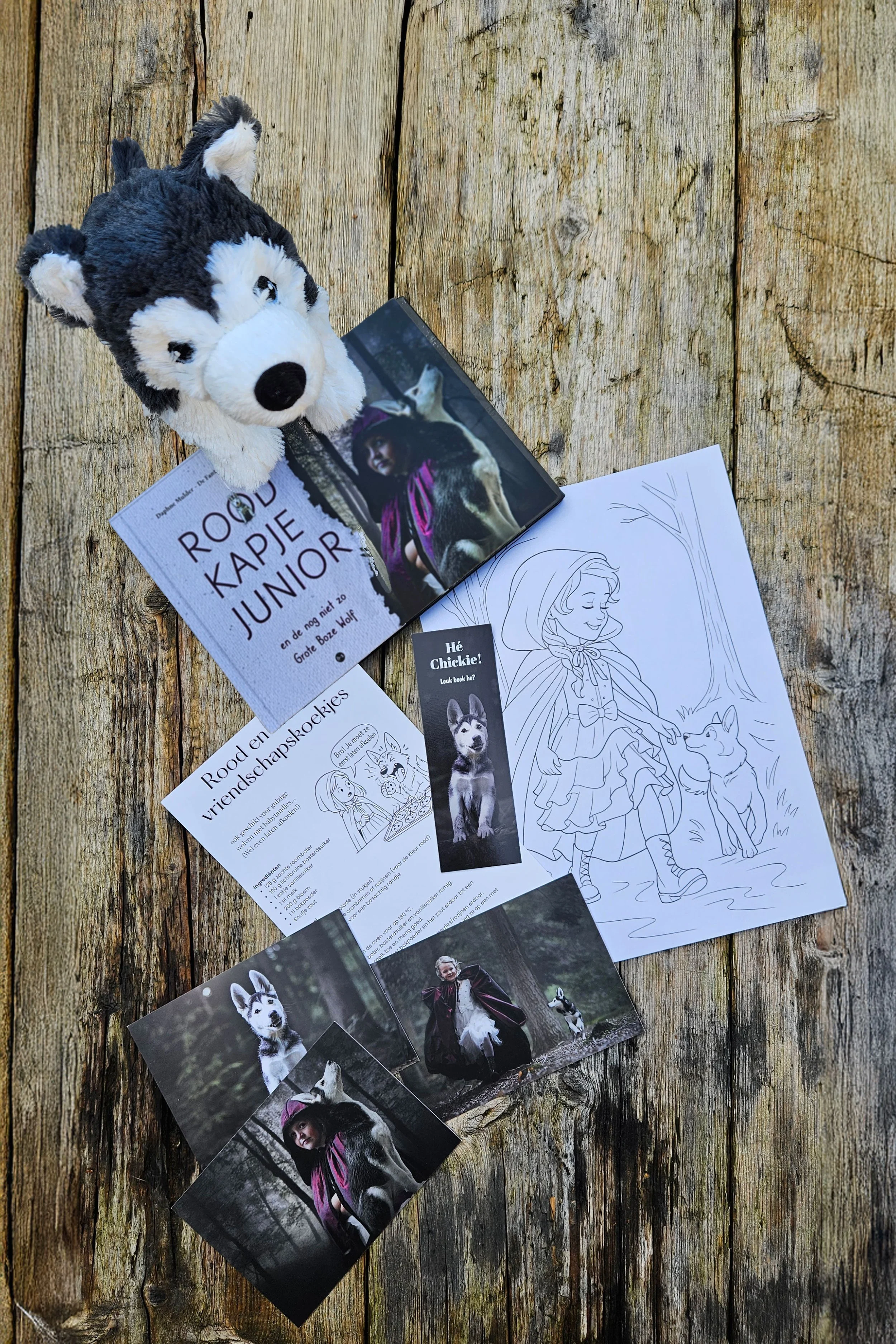 Het gesigneerde boek, een wolfknuffel, een boekenlegger, drie ansichtkaarten, een kleurplaat en het recept voor Rood en Wolf's vriendschapskoekjes.